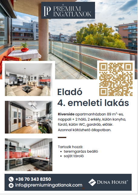 ELADÓ LAKÁS RIVERSIDE - 89 m2 - 2 hálószoba - 2 erkély - 1 autó számára mélygarázs - tágas tároló - 06703438250